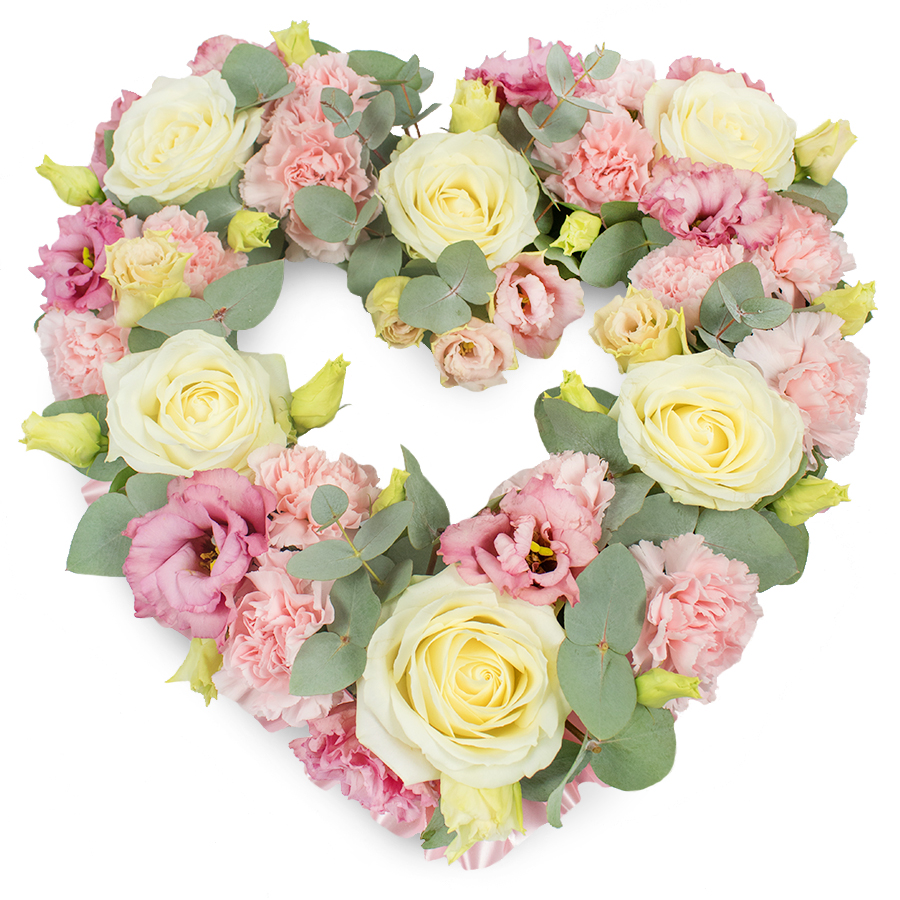 Convey your heartfelt sentiments with our sophisticated open heart tribute. This elegant bouquet consists of white roses, pink carnations, pink lisianthus, and eucalyptus leaves, all meticulously hand-selected to ensure top-tier freshness and quality.